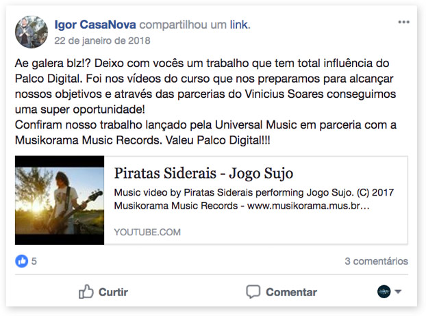 Um caso de sucesso recente que envolve meu leque de parcerias é a banda Piratas Siderais, que assinou contrato com a Universal Music e lançou oficialmente seu primeiro trabalho.